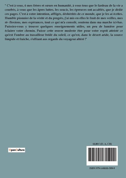 " C'est à vous, ô mes frères et s¿urs en humanité, à vous tous que le fardeau de la vie a courbés, à vous que les âpres luttes, les soucis, les épreuves ont accablés, que je dédie ces pages. C'est à votre intention, affligés, déshérités de ce monde, que je les ai écrites. Humble pionnier de la vérité et du progrès, j'ai mis en elles le fruit de mes veilles, mes ré- flexions, mes espérances, tout ce qui m'a consolé, soutenu dans ma marche ici-bas. Puissiez-vous y trouver quelques enseignements utiles, un peu de lumière pour éclairer votre chemin. Puisse cette ¿uvre modeste être pour votre esprit attristé ce qu'est l'ombre au travailleur brûlé du soleil, ce qu'est, dans le désert aride, la source limpide et fraîche, s'offrant aux regards du voyageur altéré !"