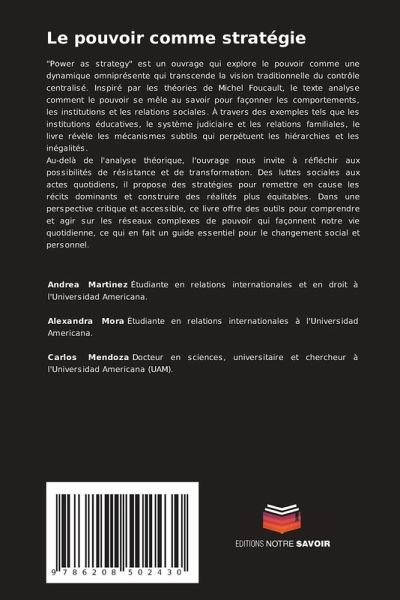 "Power as strategy" est un ouvrage qui explore le pouvoir comme une dynamique omniprésente qui transcende la vision traditionnelle du contrôle centralisé. Inspiré par les théories de Michel Foucault, le texte analyse comment le pouvoir se mêle au savoir pour façonner les comportements, les institutions et les relations sociales. À travers des exemples tels que les institutions éducatives, le système judiciaire et les relations familiales, le livre révèle les mécanismes subtils qui perpétuent les hiérarchies et les inégalités.Au-delà de l'analyse théorique, l'ouvrage nous invite à réfléchir aux possibilités de résistance et de transformation. Des luttes sociales aux actes quotidiens, il propose des stratégies pour remettre en cause les récits dominants et construire des réalités plus équitables. Dans une perspective critique et accessible, ce livre offre des outils pour comprendre et agir sur les réseaux complexes de pouvoir qui façonnent notre vie quotidienne, ce qui en fait un guide essentiel pour le changement social et personnel.