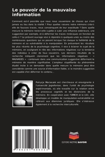 Comment est-il possible que nous nous souvenions de choses qui n'ont jamais eu lieu dans la réalité ? Pour quelles raisons notre mémoire crée-t-elle de fausses traces, nous convainquant de leur exactitude ? Dans quelle mesure la mémoire reste-t-elle sujette à subir une influence extérieure, une suggestion par exemple, et à déformer les traces mnésiques en fonction de celle-ci ? Le présent ouvrage vise à répondre à quelques-unes au moins des nombreuses questions qui se posent lorsque l'on évoque la faillibilité de la mémoire et sa vulnérabilité à la manipulation. En présentant les résultats les plus récents de la psychologie cognitive, il vise à éclairer le sujet de la mémoire, en soulignant le rôle des informations négatives sur la tendance des individus à créer de faux souvenirs. Les derniers résultats de la recherche indiquent clairement que les informations négatives - « MAUVAISES » - contenues dans une communication suggestive déforment la mémoire de manière significative. L'ampleur stupéfiante du phénomène étudié incite à se demander dans quelle mesure la mémoire peut être considérée comme une source d'information fiable, si la moindre suggestion est capable d'en déformer le contenu...