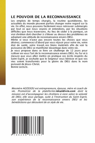 Les emplois de temps chargés, la routine quotidienne, les actualités du monde peuvent parfois changer notre regard sur la vie. En effet, nous pouvons facilement nous retrouver submergés par tout ce que nous voyons et entendons, par les situations difficiles que nous traversons. Au lieu de céder à la panique, un vrai chrétien doit chercher à s'élever au dessus des problèmes en adoptant une attitude de reconnaissance envers DIEU. Même si vous n'avez pas encore toutes les choses que vous désirez, commencez d'abord par vous réjouir pour votre vie, votre état de santé, votre travail, vos biens matériels afin de voir la puissance de DIEU se manifester davantage dans votre vie. Je vous propose dans ce livre un challenge de 12 jours pour cultiver en vous l'art de la reconnaissance envers DIEU. Au fur et à mesure que vous allez mettre en pratique ces écrits inspirés du Saint Esprit, je souhaite que le Seigneur vous bénisse et que vos vies soient transformés pour la gloire de DIEU dans le nom puissant de Jésus-Christ.Bonne Lecture.