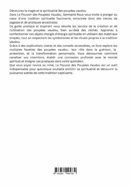 Dans Le Pouvoir des Poupées Vaudou, Germaine Roux vous invite à plonger au coeur d'une tradition spirituelle fascinante, enracinée dans des siècles de sagesse et de pra-tiques ancestrales.Ce guide pratique et inspirant vous dévoile les secrets de la création et de l'utilisation des poupées vaudou, bien au-delà des clichés. Apprenez à confectionner ces objets chargés d'énergie spirituelle en utilisant des matériaux simples, tout en respectant les symbo-lismes et les rituels propres à la tradition vaudou.Grâce à des explications claires et des conseils accessibles, ce livre explore les multiples facettes des poupées vaudou : leur rôle dans la guérison, la protection, et la transformation personnelle. Vous découvrirez comment canaliser vos intentions, établir une connexion profonde avec le monde spirituel et intégrer ces pratiques dans votre quotidien.Que vous soyez novice ou initié, Le Pouvoir des Poupées Vaudou est un outil indispen-sable pour quiconque souhaite enrichir sa spiritualité et découvrir la puissance subtile de cette tradition captivante.