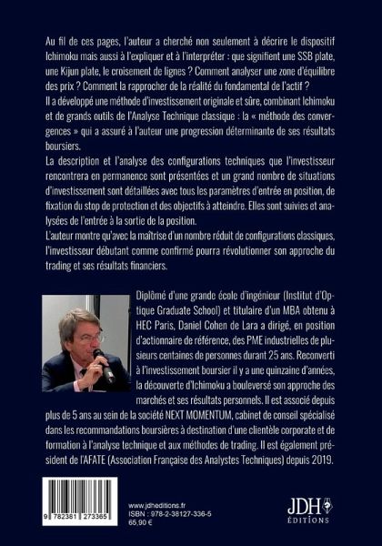 Ichimoku n'est pas un indicateur de plus de l'analyse technique des marchés boursiers, mais c'est une véritable méthode d'approche communément utilisée au Japon et sur les marchés asiatiques, et devenue récemment populaire partout ailleurs y compris chez nous. Cette approche intéressera tous les traders, mais aussi ceux qui investissent en Bourse et recherchent des points d'entrée et de sortie. Dans ce guide remarquable, tout en couleurs, l¿auteur a cherché au fil des pages non seulement à décrire le dispositif Ichimoku, mais aussi à l¿expliquer et à l¿interpréter : que signifient une SSB plate, une Kijun plate, le croisement de lignes ? Comment analyser une zone d¿équilibre des prix¿? Comment la rapprocher de la réalité du fondamental de l¿actif ? Il a développé une méthode d¿investissement originale et sûre, combinant Ichimoku et de grands outils de l¿Analyse Technique classique : la « méthode des convergences » qui a assuré à l¿auteur une progression déterminante de ses résultats boursiers. La description et l¿analyse des configurations techniques que l¿investisseur rencontrera en permanence sont présentées et un grand nombre de situations d¿investissement sont détaillées avec tous les paramètres d¿entrée en position, de fixation du stop de protection et des objectifs à atteindre. Elles sont suivies et analysées de l¿entrée à la sortie de la position. L¿auteur montre qüavec la maîtrise d¿un nombre réduit de configurations classiques, l¿investisseur débutant comme confirmé pourra révolutionner son approche du trading et ses résultats financiers. Diplômé d¿une grande école d¿ingénieur (Institut d¿Optique Graduate School) et titulaire d¿un MBA obtenu à HEC Paris, Daniel Cohen de Lara est aujourd'hui président de l'AFATE (Association Française de l'Analyse Technique). Il a dirigé, en position d¿actionnaire de référence, des PME industrielles de plusieurs centaines de personnes durant 25 ans. Reconverti à l¿investissement boursier il y a une quinzaine d¿années, la découverte d¿Ichimoku a bouleversé favorablement son approche des marchés et ses résultats personnels. Il est associé depuis plus de 5 ans au sein de la société NEXT MOMENTUM, cabinet de conseil spécialisé dans les recommandations boursières à destination d¿une clientèle corporate et de formation à l¿Analyse Technique et aux méthodes de trading.