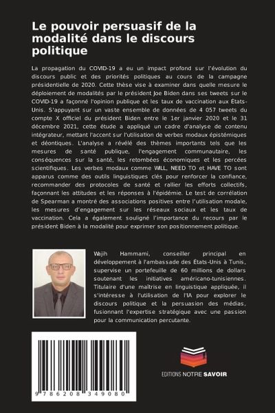 La propagation du COVID-19 a eu un impact profond sur l'évolution du discours public et des priorités politiques au cours de la campagne présidentielle de 2020. Cette thèse vise à examiner dans quelle mesure le déploiement de modalités par le président Joe Biden dans ses tweets sur le COVID-19 a façonné l'opinion publique et les taux de vaccination aux États-Unis. S'appuyant sur un vaste ensemble de données de 4 057 tweets du compte X officiel du président Biden entre le 1er janvier 2020 et le 31 décembre 2021, cette étude a appliqué un cadre d'analyse de contenu intégrateur, mettant l'accent sur l'utilisation de verbes modaux épistémiques et déontiques. L'analyse a révélé des thèmes importants tels que les mesures de santé publique, l'engagement communautaire, les conséquences sur la santé, les retombées économiques et les percées scientifiques. Les verbes modaux comme WILL, NEED TO et HAVE TO sont apparus comme des outils linguistiques clés pour renforcer la confiance, recommander des protocoles de santé et rallier les efforts collectifs, façonnant les attitudes et les réponses à l'épidémie. Le test de corrélation de Spearman a montré des associations positives entre l'utilisation modale, les mesures d'engagement sur les réseaux sociaux et les taux de vaccination. Cela a également souligné l'importance du recours par le président Biden à la modalité pour exprimer son positionnement politique.