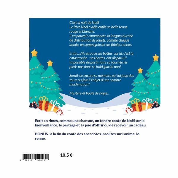 C'est la nuit de Noël . Le Père Noël a déjà enfilé sa belle tenue rouge et blanche. Il va pouvoir commencer sa longue tournée de distribution de jouets, comme chaque année, en compagnie de ses fidèles rennes.Enfin...s'il retrouve ses bottes car là c'est la catastrophe : ses bottes ont disparu !Impossible de partir faire sa tournée les pieds nus dans ce froid glacial non?Serait-ce encore sa mémoire qui lui joue des tours ou fait-il l'objet d'une sombre machination?Mystère et boule de neige....Ecrit en rimes, comme une chanson, un tendre conte de Noël sur la bienveillance, le partage, la joie d'offrir ou de recevoir un cadeau.BONUS : à la fin du conte, des anecdotes insolites sur l'animal le renne.