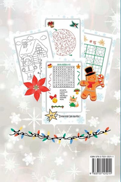 ¿ Vous souhaitez un livre d'activités de Noël pour votre enfant ? Nous vous proposons une merveilleuse histoire hivernale d'une petite étoile qui veut passer son premier Noël avec les enfants. Dans la première partie du livre, votre enfant se familiarisera avec la magie des vacances d'hiver en coloriant avec la petite étoile dans des pages uniques et amusantes, puis il pourra dessiner et résoudre de nombreux jeux avec des labyrinthes, des mots cachés, des sudokus, des points à points, et à la fin il trouvera les solutions des puzzles, ainsi que des onglets de Tic-Tac-Toe pour jouer avec vous ou avec des amis. ¿ Caractéristiques:- petite format de 15,24 x 22,86 cm facile à emporter dans un sac. - 112 pages couleur de haute qualité, parfaites pour les stylos gel ou les crayons de couleur. - couverture brillante. Si nous vous avons convaincu d'acheter ce livre, n'hésitez pas à faire défiler la page et à cliquer sur "Achetez maintenant". ¿ Joyeux Noël !