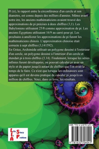 Pi (¿), le rapport entre la circonférence d'un cercle et son diamètre, est connu depuis des milliers d'années. Même avant notre ère, les anciens mathématiciens avaient trouvé des approximations de pi précises à deux chiffres (3,1). Les Babyloniens utilisaient 25/8 comme approximation de pi. Les anciens Égyptiens utilisaient 16/9 au carré pour pi. Les prochains à améliorer les approximations de pi furent les mathématiciens chinois. L'approximation chinoise était correcte à sept chiffres (3,141592). En Grèce, Archimède utilisait un polygone dessiné à l'extérieur d'un cercle, un polygone dessiné à l'intérieur d'un cercle et étendait pi à trois chiffres (3,14). Finalement, lorsque les séries infinies furent développées, on pouvait calculer pi avec un stylo et du papier jusqu'à autant de chiffres que l'on avait le temps de le faire. Ce n'est que lorsque les ordinateurs sont apparus qu'il est devenu pratique de calculer pi jusqu'à un million de chiffres. Voici, dans ce livre, les résultats.
