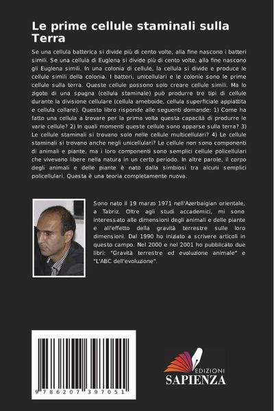 Se una cellula batterica si divide più di cento volte, alla fine nascono i batteri simili. Se una cellula di Euglena si divide più di cento volte, alla fine nascono gli Euglena simili. In una colonia di cellule, la cellula si divide e produce le cellule simili della colonia. I batteri, unicellulari e le colonie sono le prime cellule sulla terra. Queste cellule possono solo creare cellule simili. Ma lo zigote di una spugna (cellula staminale) può produrre tre tipi di cellule durante la divisione cellulare (cellula ameboide, cellula superficiale appiattita e cellula collare). Questo libro risponde alle seguenti domande: 1) Come ha fatto una cellula a trovare per la prima volta questa capacità di produrre le varie cellule? 2) In quali momenti queste cellule sono apparse sulla terra? 3) Le cellule staminali si trovano solo nelle cellule multicellulari? 4) Le cellule staminali si trovano anche negli unicellulari? Le cellule non sono componenti di animali e piante, ma i loro componenti sono semplici cellule policellulari che vivevano libere nella natura in un certo periodo. In altre parole, il corpo degli animali e delle piante è nato dalla simbiosi tra alcuni semplici policellulari. Questa è una teoria completamente nuova.