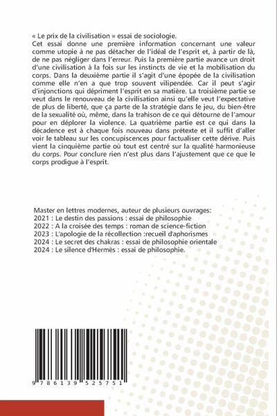 « Le prix de la civilisation » essai de sociologie.Cet essai donne une première information concernant une valeur comme utopie à ne pas détacher de l'idéal de l'esprit et, à partir de là, de ne pas négliger dans l'erreur. Puis la première partie avance un droit d'une civilisation à la fois sur les instincts de vie et la mobilisation du corps. Dans la deuxième partie il s'agit d'une épopée de la civilisation comme elle n'en a que trop souvent vilipendée. Car il peut s'agir d'injonctions qui dépriment l'esprit en sa matière. La troisième partie se veut dans le renouveau de la civilisation ainsi qu'elle veut l'expectative de plus de liberté, que ça parte de la stratégie dans le jeu, du bien-être de la sexualité où, même, dans la trahison de ce qui détourne de l'amour pour en déplorer la violence. La quatrième partie est ce qui dans la décadence est à chaque fois nouveau dans prétexte et il suffit d'aller voir le tableau sur les concupiscences pour factualiser cette dérive. Puis vient la cinquième partie où tout est centré sur la qualité harmonieuse du corps. Pour conclure rien n'est plus dans l'ajustement que ce que le corps prodigue à l'esprit.