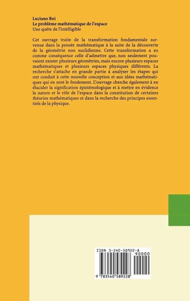 Cet ouvrage traite de la transformation fondamentale survenue dans la pensée mathématique à la suite de la découverte de la géometrie non euclidienne. Cette transformation a eu comme conséquence celle d'admettre que, non seulement pouvaient exister plusieurs géometries, mais encore plusieurs espaces mathématiques et plusieurs espaces physiques différents. La recherche s'attache en grande partie à analyser les étapes qui ont conduit à cette nouvelle conception et aux idées mathématiques qui en sont le fondement. Le livre cherche également a en élucider la signification épistémologique et à mettre en évidence la nature et le rôle de l'espace dans la constitution de certaines théories mathématiques et dans la recherche des principes essentiels de la physique.