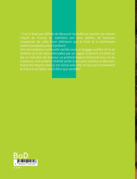 " Il ne m'était pas difficile de découvrir la meilleure manière de cultiver l'esprit de France, de satisfaire son âme altérée, de favoriser l'expansion de cette force intérieure que le froid et la sécheresse avaient paralysée jusqu'à présent.Une bienveillance continuelle cachée sous un langage austère et ne se révélant qu'à de rares intervalles par un regard empreint d'intérêt ou par un mot plein de douceur, un profond respect dissimulé sous un air impérieux, une certaine sévérité jointe à des soins assidus et dévoués, furent les moyens dont je me servis avec elle, et ceux qui convenaient le mieux à sa nature aussi fière que sensible."