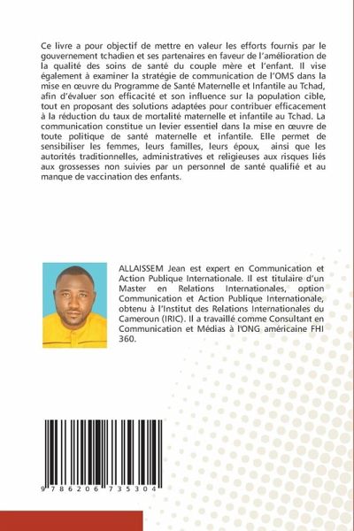 Ce livre a pour objectif de mettre en valeur les efforts fournis par le gouvernement tchadien et ses partenaires en faveur de l'amélioration de la qualité des soins de santé du couple mère et l'enfant. Il vise également à examiner la stratégie de communication de l'OMS dans la mise en oeuvre du Programme de Santé Maternelle et Infantile au Tchad, afin d'évaluer son efficacité et son influence sur la population cible, tout en proposant des solutions adaptées pour contribuer efficacement à la réduction du taux de mortalité maternelle et infantile au Tchad. La communication constitue un levier essentiel dans la mise en oeuvre de toute politique de santé maternelle et infantile. Elle permet de sensibiliser les femmes, leurs familles, leurs époux, ainsi que les autorités traditionnelles, administratives et religieuses aux risques liés aux grossesses non suivies par un personnel de santé qualifié et au manque de vaccination des enfants.