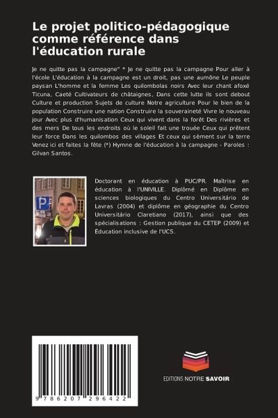 Je ne quitte pas la campagne" * Je ne quitte pas la campagne Pour aller à l'école L'éducation à la campagne est un droit, pas une aumône Le peuple paysan L'homme et la femme Les quilombolas noirs Avec leur chant afoxé Ticuna, Caeté Cultivateurs de châtaignes, Dans cette lutte ils sont debout Culture et production Sujets de culture Notre agriculture Pour le bien de la population Construire une nation Construire la souveraineté Vivre le nouveau jour Avec plus d'humanisation Ceux qui vivent dans la forêt Des rivières et des mers De tous les endroits où le soleil fait une trouée Ceux qui prêtent leur force Dans les quilombos des villages Et ceux qui sèment sur la terre Venez ici et faites la fête (*) Hymne de l'éducation à la campagne - Paroles : Gilvan Santos.