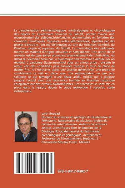La caractérisation sédimentologique, minéralogique et chronologique des dépôts du Quaternaire terminal du Tafilalt, permet d'avoir une reconstitution des paléoenvironnements sédimentaires en fonction des variations climatiques. Plusieurs unités sédimentaires, séparées par des phases d'érosions, ont été distinguées au sein du Soltanien terminal, du Rharbien moyen et supérieur du Tafilalt. La minéralogie des sédiments montre un matériel d'origine atlasique et hamadienne. Une partie de ce matériel est de type éolien provenant essentiellement de l'Anti-Atlas. Au début du Soltanien terminal, la dynamique sédimentaire a débuté par un matériel à caractère fluvio-torrentiel sous un climat aride ; ensuite le retour vers des conditions plus humides favorise la mise en place de dépôts fins. A l'Holocène, après une érosion généralisée, une phase de comblement se met en place avec une sédimentation un peu plus sableuse ce qui témoigne d'une phase aride. Aridité qui a perduré jusqu'à l'actuel avec une récurrence humide au Rharbien historique enregistrée par des niveaux hydromorphes. Les travertins se sont mis en place dans la région, depuis le stade isotopique 9 jusqu'au stade isotopique 2.