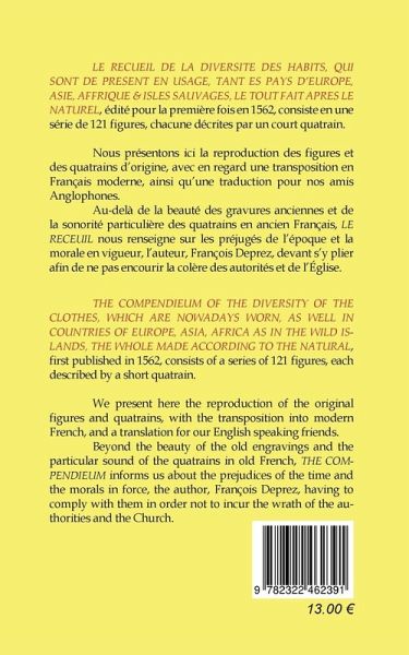 LE RECUEIL DE LA DIVERSITÉ DES HABITS, édité pour la première fois en 1562, consiste en une série de 121 figures, chacune décrite par un court quatrain.Nous présentons ici la reproduction des figures et des quatrains d'origine, avec en regard une transposition en Français moderne, ainsi qu'une traduction pour nos amis Anglophones.Au-delà de la beauté des gravures anciennes et de la sonorité particulière des quatrains en ancien Français, le RECUEIL nous renseigne sur les préjugés de l'époque et la morale en vigueur, l'auteur, François Deprez, devant s'y plier afin de ne pas encourir la colère des autorités et de l'église.THE COMPENDIEUM OF THE DIVERSITY OF THE CLOTHES, first published in 1562, consists of a series of 121 figures, each described by a short quatrain.We present here the reproduction of the original figures and quatrains, with the transposition into modern French, and a translation for our English speaking friends.Beyond the beauty of the old engravings and the particular sound of the quatrains in old French, THE COMPENDIEUM informs us about the prejudices of the time and the morals in force, the author, François Deprez, having to comply with them in order not to incur the wrath of the authorities and the Church.