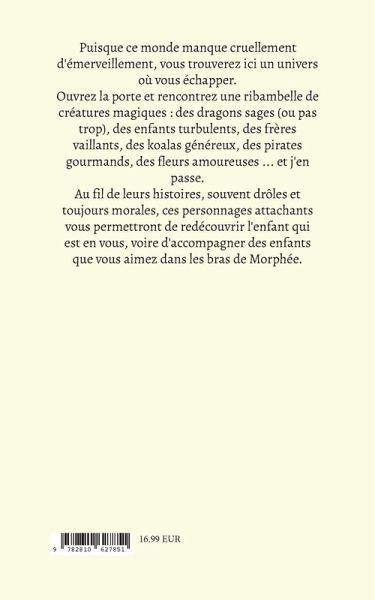 Puisque ce monde manque cruellement d'émerveillement, vous trouverez ici un univers où vous échapper. Ouvrez la porte et rencontrez une ribambelle de créatures magiques : des dragons sages (ou pas trop), des enfants turbulents, des frères vaillants, des koalas généreux, des pirates gourmands, des fleurs amoureuses ... et j'en passe. Au fil de leurs histoires, souvent drôles et toujours morales, ces personnages attachants vous permettront de redécouvrir l'enfant qui est en vous, voire d'accompagner des enfants que vous aimez dans les bras de Morphée.