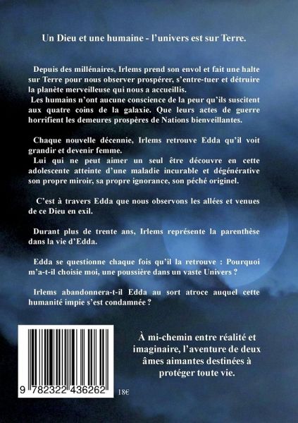Depuis des millénaires, Irlems prend son envol et fait une halte sur Terre pour nous observer prospérer, s'entre-tuer et détruires la planète merveilleuse qui nous a accueillis.Les humains n'ont aucune conscience de la peur qu'ils suscitent aux quatre coins de la galaxie. Que leurs actes de guerre horrifient les demeures prospères de Nations bienveillantes.Chaque nouvelle décennie, Irlems retrouve Edda qu'il voit grandir et devenir femme.Lui qui ne peut aimer un seul être découvre en cette adolescente atteinte d'une maladie incurable et dégérérative son propre miroir, sa propre ignorance, son péché originel.C'est à travers Edda que nous observons les allées et venues de ce Dieu en exl.C'est à travers la vie d'Edda que nous découvrons les bribes de celle d'Irlems.Durant plus de trente ans, Irlems représente la parenthèse dans la vie d'Edda.Edda se questionne chaque fois qu'il la retrouve : Pourquoi m'a-t-il choisie moi, une poussière dans un vaste univers ?Irlems abandonnera-t-il Edda au sort atroce auquel cette humainité impie s'est condamnée ?A mi-chemin entre réalité et imaginaire, l'histoire de deux âmes aimante destinés à protéger toute vie.