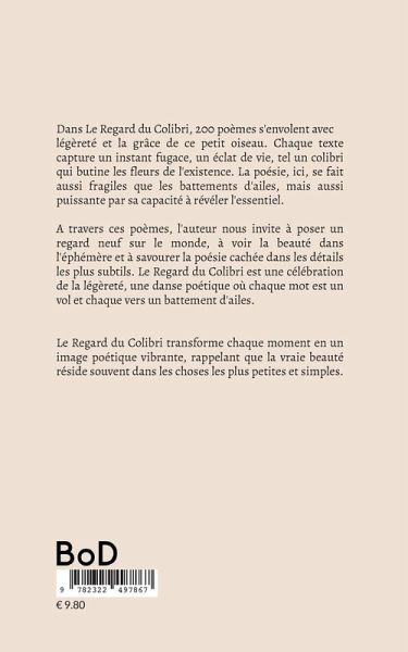 Dans Le Regard du Colibri, 200 poèmes s'envolent avec légèreté et la grâce de ce petit oiseau. Chaque texte capture un instant fugace, un éclat de vie, tel un colibri qui butine les fleurs de l'existence. La poésie, ici, se fait aussi fragiles que les battements d'ailes, mais aussi puissante par sa capacité à révéler l'essentiel. A travers ces poèmes, l'auteur nous invite à poser un regard neuf sur le monde, à voir la beauté dans l'éphémère et à savourer la poésie cachée dans les détails les plus subtils. Le Regard du Colibri est une célébration de la légèreté, une danse poétique où chaque mot est un vol et chaque vers un battement d'ailes. Le Regard du Colibri transforme chaque moment en un image poétique vibrante, rappelant que la vraie beauté réside souvent dans les choses les plus petites et simples.