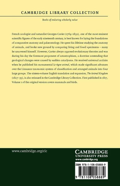 French zoologist and naturalist Georges Cuvier (1769-1832), one of the most eminent scientific figures of the early nineteenth century, is best known for laying the foundations of comparative anatomy and palaeontology. He spent his lifetime studying the anatomy of animals, and broke new ground by comparing living and fossil specimens - many he uncovered himself. However, Cuvier always opposed evolutionary theories and was during his day the foremost proponent of catastrophism, a doctrine contending that geological changes were caused by sudden cataclysms. He received universal acclaim when he published his monumental Le règne animal, which made significant advances over the Linnaean taxonomic system of classification and arranged animals into four large groups. The sixteen-volume English translation and expansion, The Animal Kingdom (1827-35), is also reissued in the Cambridge Library Collection. First published in 1817, Volume 1 of the original version covers mammals and birds.