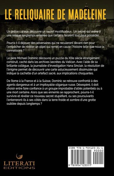 Un prêtre curieux découvre un secret mystificateur... Un secret qui mène à une relique longtemps enterrée que certains feraient tout pour posséder. Pourra-t-il déjouer des adversaires qui ne reculeront devant rien pour l'empêcher de révéler un objet qui remet en cause l'histoire telle que nous la connaissons ? Le père Michael Dominic découvre un puzzle du XIIIe siècle étrangement construit, caché dans les archives secrètes du Vatican. Avec l'aide de sa brillante collègue, la journaliste d'investigation Hana Sinclair, la résolution de l'énigme permet de découvrir une carte astucieusement dissimulée qui indique la cachette d'un artefact sacré, aux implications choquantes. De Rome à la France et à la Suisse, Dominic se retrouve confronté à des agents dangereux et à un impitoyable oligarque russe. Désespéré, il doit choisir entre faire confiance à un groupe improbable d'alliés potentiels ou à une mort certaine. Alors que ses ennemis se rapprochent, pourra-t-il survivre et révéler ce nouveau secret stupéfiant, ou ses poursuivants l'enterreront-ils à ses côtés dans la terre froide et sombre d'une grotte oubliée depuis longtemps ?