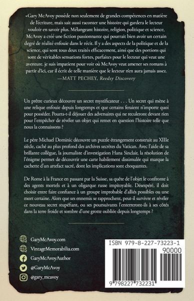 Un prêtre curieux découvre un secret mystificateur... Un secret qui mène à une relique longtemps enterrée que certains feraient tout pour posséder. Pourra-t-il déjouer des adversaires qui ne reculeront devant rien pour l'empêcher de révéler un objet qui remet en cause l'histoire telle que nous la connaissons ? Le père Michael Dominic découvre un puzzle du XIIIe siècle étrangement construit, caché dans les archives secrètes du Vatican. Avec l'aide de sa brillante collègue, la journaliste d'investigation Hana Sinclair, la résolution de l'énigme permet de découvrir une carte astucieusement dissimulée qui indique la cachette d'un artefact sacré, aux implications choquantes. De Rome à la France et à la Suisse, Dominic se retrouve confronté à des agents dangereux et à un impitoyable oligarque russe. Désespéré, il doit choisir entre faire confiance à un groupe improbable d'alliés potentiels ou à une mort certaine. Alors que ses ennemis se rapprochent, pourra-t-il survivre et révéler ce nouveau secret stupéfiant, ou ses poursuivants l'enterreront-ils à ses côtés dans la terre froide et sombre d'une grotte oubliée depuis longtemps ?