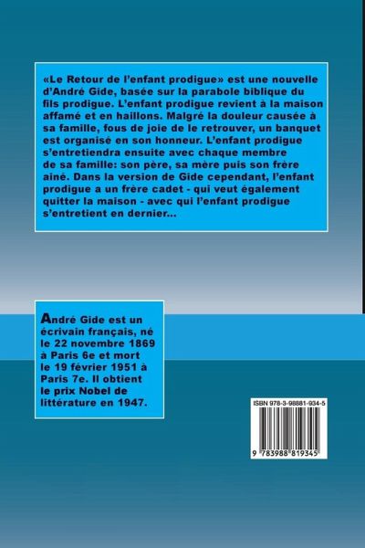Le Retour de l'enfant prodigue est une nouvelle d'André Gide, basée sur la parabole biblique du fils prodigue. L'enfant prodigue revient à la maison affamé et en haillons. Malgré la douleur causée à sa famille, fous de joie de le retrouver, un banquet est organisé en son honneur. L'enfant prodigue s'entretiendra ensuite avec chaque membre de sa famille: son père, sa mère puis son frère ainé. Dans la version de Gide cependant, l'enfant prodigue a un frère cadet - qui veut également quitter la maison - avec qui l'enfant prodigue s'entretient en dernier...