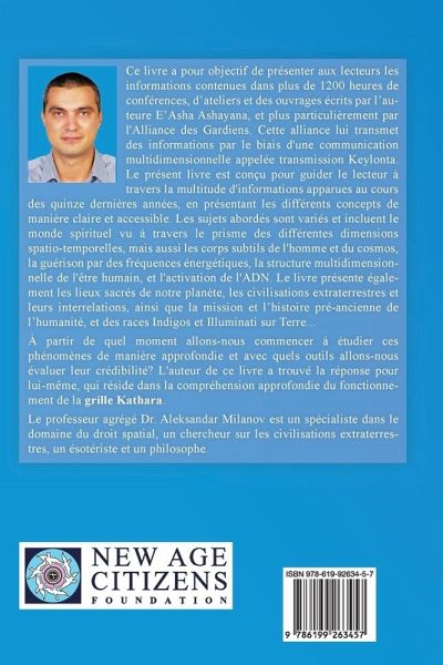 Ce livre a pour objectif de présenter aux lecteurs les informations contenues dans plus de 1200 heures de conférences, d'ateliers et des ouvrages écrits par l'auteure E'Asha Ashayana, et plus particulièrement par l'Alliance des Gardiens. Cette alliance lui transmet des informations par le biais d'une communication multidimensionnelle appelée transmission Keylonta. Le présent livre est conçu pour guider le lecteur à travers la multitude d'informations apparues au cours des quinze dernières années, en présentant les différents concepts de manière claire et accessible. Les sujets abordés sont variés et incluent le monde spirituel vu à travers le prisme des différentes dimensions spatio-temporelles, mais aussi les corps subtils de l'homme et du cosmos, la guérison par des fréquences énergétiques, la structure multidimensionnelle de l'être humain, et l'activation de l'ADN. Le livre présente également les lieux sacrés de notre planète, les civilisations extraterrestres et leurs interrelations, ainsi que la mission et l'histoire pré-ancienne de l'humanité, et des races Indigos et Illuminati sur Terre... À partir de quel moment allons-nous commencer à étudier ces phénomènes de manière approfondie et avec quels outils allons-nous évaluer leur crédibilité? L'auteur de ce livre a trouvé la réponse pour lui-même, qui réside dans la compréhension approfondie du fonctionnement de la grille Kathara. Le professeur agrégé Dr. Aleksandar Milanov est un spécialiste dans le domaine du droit spatial, un chercheur sur les civilisations extraterrestres, un ésotériste et un philosophe.