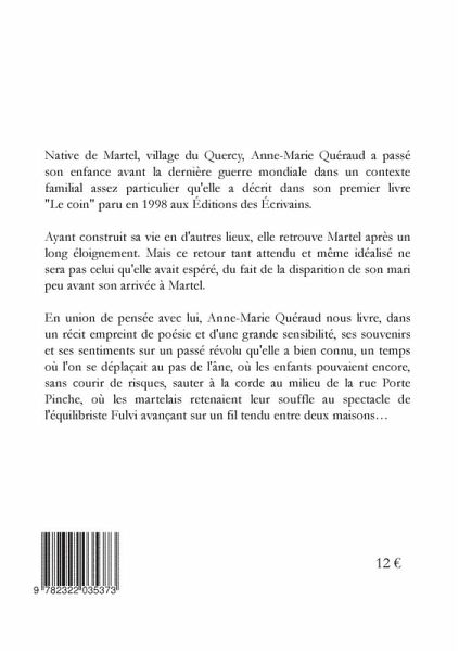 Native de Martel, village du Quercy, Anne-Marie Quéraud a passé son enfance avant la dernière guerre mondiale dans un contexte familial assez particulier qu'elle a décrit dans son premier livre "Le coin" paru en 1998 aux Éditions des Écrivains.Ayant construit sa vie en d'autres lieux, elle retrouve Martel après un long éloignement. Mais ce retour tant attendu et même idéalisé ne sera pas celui qu'elle avait espéré, du fait de la disparition de son mari peu avant son arrivée à Martel.En union de pensée avec lui, Anne-Marie Quéraud nous livre, dans un récit empreint de poésie et d'une grande sensibilité, ses souvenirs et ses sentiments sur un passé révolu qu'elle a bien connu, un temps où l'on se déplaçait au pas de l'âne, où les enfants pouvaient encore, sans courir de risques, sauter à la corde au milieu de la rue Porte Pinche, où les martelais retenaient leur souffle au spectacle de l'équilibriste Fulvi avançant sur un fil tendu entre deux maisons...