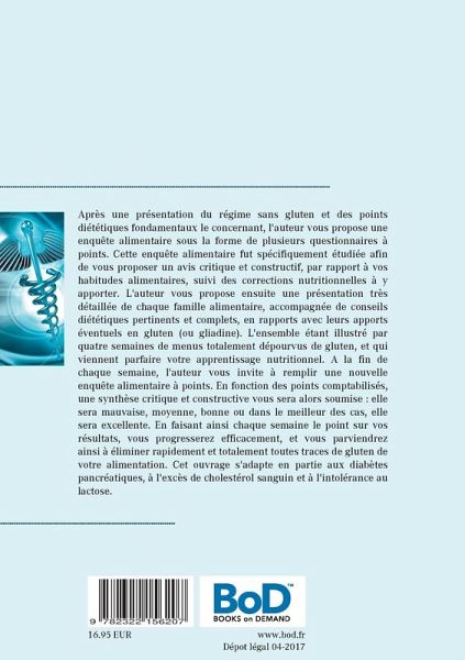 Comment se présente cet ouvrage ?1- Nous commencerons par une enquête alimentaire.Cette enquête alimentaire sous forme de questionnaires, sera partagée en trois tableaux à points : le premier concernera votre petit-déjeuner, le deuxième votre déjeuner, le dernier vous interrogera sur votre dîner. Bien entendu, celle-ci est spécifiquement étudiée, afin de me permettre de vous fournir un avis critique et constructif sur vos habitudes alimentaires en rapport avec vos apports alimentaires actuels en gluten.En fonction des points obtenus au sein de chaque repas, je vous proposerai un avis nutritionnel constructif et critique, en relation avec vos habitudes alimentaires actuelles.Notre premier travail aura donc pour but de vous permettre de prendre conscience de vos erreurs alimentaires, suivi d'une correction de celles-ci.2- Je vous présenterai chaque famille alimentaire.Il s'agira de vous familiariser avec toutes les familles alimentaires, de vous permettre de mieux connaître les sources de gluten, et cela afin de mieux gérer sur le plan nutritionnel votre régime alimentaire sans gluten.De nombreux conseils diététiques vous seront proposés, vous aidant ensuite à faire les meilleurs choix.3- Place à la pratique !Ce troisième chapitre concernera la diététique pure.En effet, dans la première partie de ce chapitre, je vous proposerai l'élaboration de six jours de menus très détaillés concernant vos petits-déjeuners, déjeuners et dîners. Cette partie ayant pour but l'apprentissage de vos nouvelles habitudes alimentaires totalement dépourvues de gluten.Dans la deuxième partie, je vous proposerai trois semaines de menus adaptées à votre régime sans gliadine (sans gluten). Ces trois semaines de menus viendront illustrer et clore votre apprentissage nutritionnel.4- Les bilans diététiques hebdomadaires.A la fin de chaque semaine, je vous proposerai une nouvelle enquête alimentaire à points.En fonction des points hebdomadaires obtenus, une synthèse critique et constructive vous sera alors soumise : elle sera mauvaise, moyenne, bonne ou elle sera excellente.Cette synthèse hebdomadaire vous aidera à progresser efficacement et intelligemment dans votre nouvelle alimentation sans gluten : le but étant de toujours s'améliorer, semaine après semaine.En faisant ainsi régulièrement le point sur vos résultats, vous parviendrez très rapidement au "zéro gluten" dans votre alimentation courante !