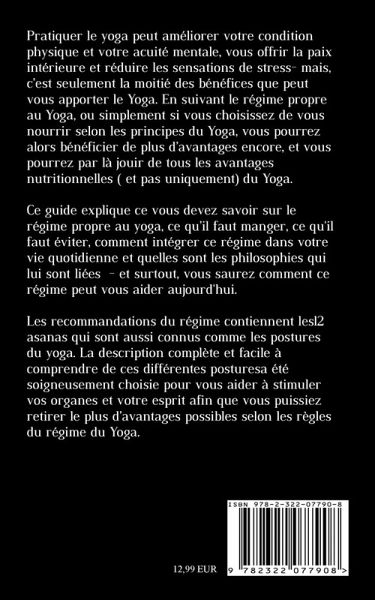 Pratiquer le yoga peut améliorer votre condition physique et votre acuité mentale, vous offrir la paix intérieure et réduire les sensations de stress- mais, c'est seulement la moitié des bénéfices que peut vous apporter le Yoga. En suivant le régime propre au Yoga, ou simplement si vous choisissez de vous nourrir selon les principes du Yoga, vous pourrez alors bénéficier de plus d'avantages encore, et vous pourrez par là jouir de tous les avantages nutritionnelles ( et pas uniquement) du Yoga.Ce guide explique ce vous devez savoir sur le régime propre au yoga, ce qu'il faut manger, ce qu'il faut éviter, comment intégrer ce régime dans votre vie quotidienne et quelles sont les philosophies qui lui sont liées - et surtout, vous saurez comment ce régime peut vous aider aujourd'hui.Les recommandations du régime contiennent les12 asanas qui sont aussi connus comme les postures du yoga. La description complète et facile à comprendre de ces différentes postures a été soigneusement choisie pour vous aider à stimuler vos organes et votre esprit afin que vous puissiez retirer le plus d'avantages possibles selon les règles du régime du Yoga.
