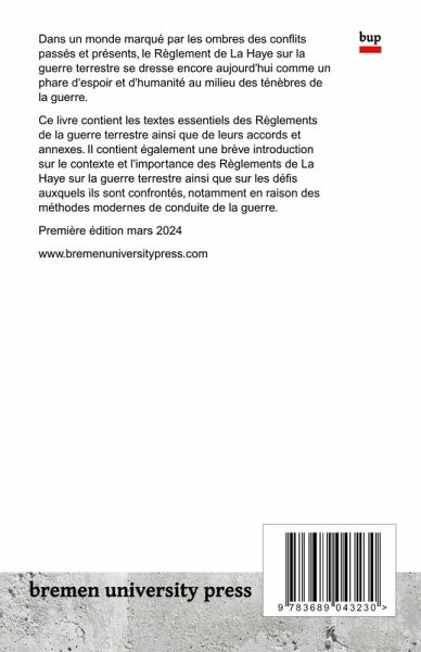 Dans un monde marqué par les ombres des conflits passés et présents, le Règlement de La Haye sur la guerre terrestre se dresse encore aujourd'hui comme un phare d'espoir et d'humanité au milieu des ténèbres de la guerre. Ce livre contient les textes essentiels des Règlements de la guerre terrestre ainsi que de leurs accords et annexes. Il contient également une brève introduction sur le contexte et l'importance des Règlements de La Haye sur la guerre terrestre ainsi que sur les défis auxquels ils sont confrontés, notamment en raison des méthodes modernes de conduite de la guerre.