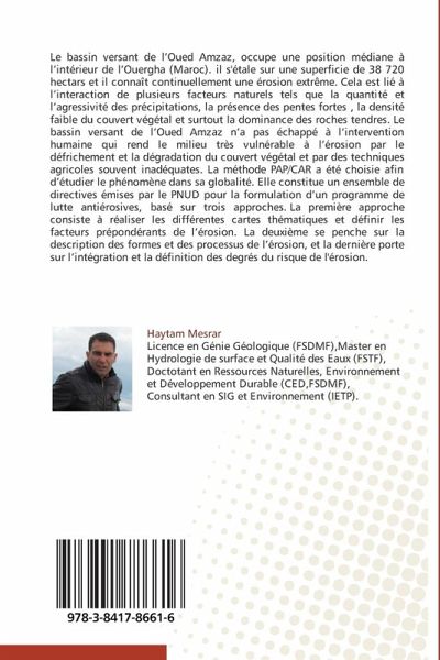 Le bassin versant de l'Oued Amzaz, occupe une position médiane à l'intérieur de l'Ouergha (Maroc). il s'étale sur une superficie de 38 720 hectars et il connaît continuellement une érosion extrême. Cela est lié à l'interaction de plusieurs facteurs naturels tels que la quantité et l'agressivité des précipitations, la présence des pentes fortes , la densité faible du couvert végétal et surtout la dominance des roches tendres. Le bassin versant de l'Oued Amzaz n'a pas échappé à l'intervention humaine qui rend le milieu très vulnérable à l'érosion par le défrichement et la dégradation du couvert végétal et par des techniques agricoles souvent inadéquates. La méthode PAP/CAR a été choisie afin d'étudier le phénomène dans sa globalité. Elle constitue un ensemble de directives émises par le PNUD pour la formulation d'un programme de lutte antiérosives, basé sur trois approches. La première approche consiste à réaliser les différentes cartes thématiques et définir les facteurs prépondérants de l'érosion. La deuxième se penche sur la description des formes et des processus de l'érosion, et la dernière porte sur l'intégration et la définition des degrés du risque de l'érosion.