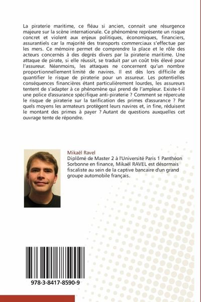 La piraterie maritime, ce fléau si ancien, connait une résurgence majeure sur la scène internationale. Ce phénomène représente un risque concret et violent aux enjeux politiques, économiques, financiers, assurantiels car la majorité des transports commerciaux s'effectue par les mers. Ce mémoire permet de comprendre la place et le rôle des acteurs concernés à des degrés divers par la piraterie maritime. Une attaque de pirate, si elle réussit, se traduit par un coût très élevé pour l'assureur. Néanmoins, les attaques ne concernent qu'un nombre proportionnellement limité de navires. Il est dès lors difficile de quantifier le risque de piraterie pour un assureur. Les potentielles conséquences financières étant particulièrement lourdes, les assureurs tentent de s'adapter à ce phénomène qui prend de l'ampleur. Existe-t-il une police d'assurance spécifique anti-piraterie ? Comment se répercute le risque de piraterie sur la tarification des primes d'assurance ? Par quels moyens les armateurs protègent leurs navires et, in fine, réduisent le montant des primes à payer ? Autant de questions auxquelles cet ouvrage tente de répondre.