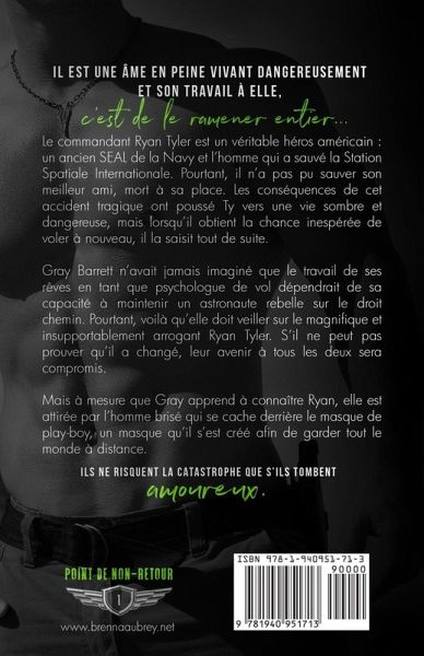 Il est une âme en peine vivant dangereusement et son travail à elle, c'est de le ramener entier... Le commandant Ryan Tyler est un véritable héros américain : un ancien SEAL de la Navy et l'homme qui a sauvé la Station Spatiale Internationale. Pourtant, il n'a pas pu sauver son meilleur ami, mort à sa place. Les conséquences de cet accident tragique ont poussé Ty vers une vie sombre et dangereuse, mais lorsqu'il obtient la chance inespérée de voler à nouveau, il la saisit tout de suite. Gray Barrett n'avait jamais imaginé que le travail de ses rêves en tant que psychologue de vol dépendrait de sa capacité à maintenir un astronaute rebelle sur le droit chemin. Pourtant, voilà qu'elle doit veiller sur le magnifique et insupportablement arrogant Ryan Tyler. S'il ne peut pas prouver qu'il a changé, leur avenir à tous les deux sera compromis. Mais à mesure que Gray apprend à connaître Ryan, elle est attirée par l'homme brisé qui se cache derrière le masque de play-boy, un masque qu'il s'est créé afin de garder tout le monde à distance. Ils ne risquent la catastrophe que s'ils tombent amoureux.
