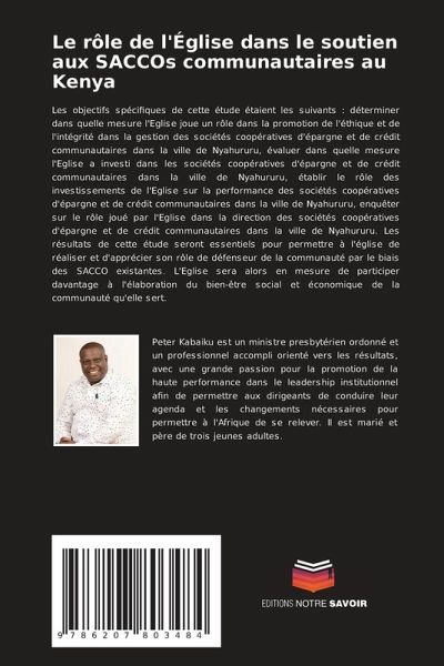 Les objectifs spécifiques de cette étude étaient les suivants : déterminer dans quelle mesure l'Eglise joue un rôle dans la promotion de l'éthique et de l'intégrité dans la gestion des sociétés coopératives d'épargne et de crédit communautaires dans la ville de Nyahururu, évaluer dans quelle mesure l'Eglise a investi dans les sociétés coopératives d'épargne et de crédit communautaires dans la ville de Nyahururu, établir le rôle des investissements de l'Eglise sur la performance des sociétés coopératives d'épargne et de crédit communautaires dans la ville de Nyahururu, enquêter sur le rôle joué par l'Eglise dans la direction des sociétés coopératives d'épargne et de crédit communautaires dans la ville de Nyahururu. Les résultats de cette étude seront essentiels pour permettre à l'église de réaliser et d'apprécier son rôle de défenseur de la communauté par le biais des SACCO existantes. L'Eglise sera alors en mesure de participer davantage à l'élaboration du bien-être social et économique de la communauté qu'elle sert.