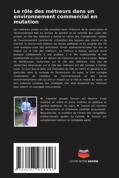 Les métreurs jouent un rôle essentiel dans l'industrie de la construction et l'environnement bâti en termes de gestion et de contrôle des coûts des projets. Le rôle des métreurs a évolué en raison des changements rapides de l'environnement commercial. L'évolution des besoins des clients et du marché, la concurrence intense, les forces politiques et les progrès des TIC sont quelques-unes des principales forces environnementales qui ont un impact sur le rôle des métreurs. Le métreur a évolué, passant d'une pratique traditionnelle à une pratique à la fois traditionnelle et non traditionnelle au sein et en dehors de l'industrie de la construction. Malgré de nombreuses recherches sur le rôle des métreurs, très peu de recherches empiriques sur le rôle des métreurs ont été menées à Sainte-Lucie. Ce livre fournit donc une évaluation du rôle du métré en général et en particulier dans le contexte de Sainte-Lucie. En outre, le livre souligne l'importance de l'analyse de l'environnement et des forces environnementales clés qui ont un impact sur le rôle du métré. En outre, ce livre présente certaines des stratégies clés dont disposent les métreurs pour obtenir un avantage concurrentiel.