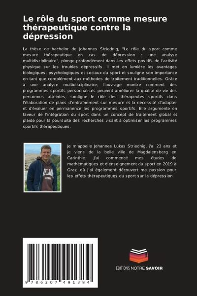 La thèse de bachelor de Johannes Striednig, "Le rôle du sport comme mesure thérapeutique en cas de dépression : une analyse multidisciplinaire", plonge profondément dans les effets positifs de l'activité physique sur les troubles dépressifs. Il met en lumière les avantages biologiques, psychologiques et sociaux du sport et souligne son importance en tant que complément aux méthodes de traitement traditionnelles. Grâce à une analyse multidisciplinaire, l'ouvrage montre comment des programmes sportifs personnalisés peuvent améliorer la qualité de vie des personnes atteintes, souligne le rôle des thérapeutes sportifs dans l'élaboration de plans d'entraînement sur mesure et la nécessité d'adapter et d'évaluer en permanence les programmes sportifs. Elle argumente en faveur de l'intégration du sport dans un concept de traitement global et plaide pour la poursuite des recherches visant à optimiser les programmes sportifs thérapeutiques.