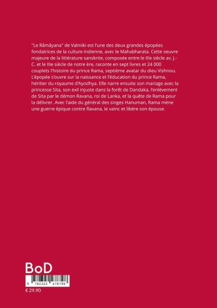 "Le Râmâyana" de Valmiki est l'une des deux grandes épopées fondatrices de la culture indienne, avec le Mahabharata. Cette oeuvre majeure de la littérature sanskrite, composée entre le IIIe siècle av. J.-C. et le IIIe siècle de notre ère, raconte en sept livres et 24 000 couplets l'histoire du prince Rama, septième avatar du dieu Vishnou. L'épopée s'ouvre sur la naissance et l'éducation du prince Rama, héritier du royaume d'Ayodhya. Elle narre ensuite son mariage avec la princesse Sita, son exil injuste dans la forêt de Dandaka, l'enlèvement de Sita par le démon Ravana, roi de Lanka, et la quête de Rama pour la délivrer. Avec l'aide du général des singes Hanuman, Rama mène une guerre épique contre Ravana, le vainc et libère son épouse. Le Râmâyana s'inscrit parfaitement dans les catégories "Mythologie hindoue", "Littérature classique indienne" et "Épopées" d'Amazon. Il explore des thèmes universels comme le devoir, la loyauté, l'amour et le triomphe du bien sur le mal, tout en offrant un aperçu fascinant de la civilisation indienne antique. Valmiki, considéré comme le premier poète (Adi Kavi) de la littérature sanskrite, mêle habilement récits mythologiques, enseignements moraux et philosophiques. Son oeuvre a profondément influencé la culture, l'art et la spiritualité du sous-continent indien et de l'Asie du Sud-Est pendant des millénaires. Cette épopée demeure extrêmement populaire en Inde et au-delà, ayant été traduite dans de nombreuses langues et adaptée sous diverses formes artistiques. Elle continue d'inspirer et de guider des millions de personnes, faisant du Râmâyana un véritable trésor de la littérature mondiale.