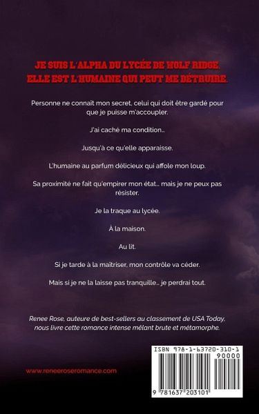 JE SUIS L'ALPHA DU LYCÉE DE WOLF RIDGE. ELLE EST L'HUMAINE QUI PEUT ME DÉTRUIRE. Personne ne connaît mon secret, celui qui doit être gardé pour que je puisse m'accoupler. J'ai caché ma condition... Jusqu'à ce qu'elle apparaisse. L'humaine au parfum délicieux qui affole mon loup. Sa proximité ne fait qu'empirer mon état... mais je ne peux pas résister. Je la traque au lycée. À la maison. Au lit. Si je tarde à la maîtriser, mon contrôle va céder. Mais si je ne la laisse pas tranquille... je perdrai tout. Renee Rose, auteure de best-sellers au classement de USA Today, nous livre cette romance intense mêlant brute et métamorphe.