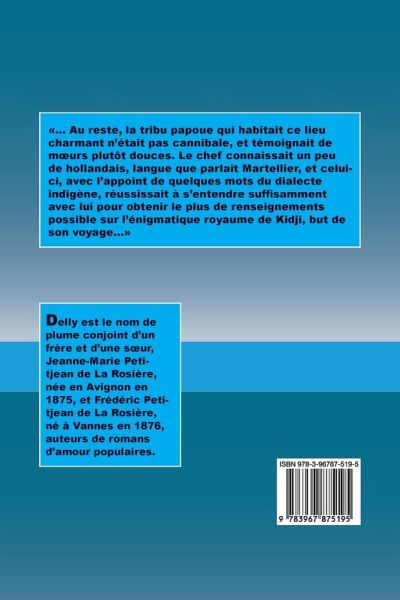 ... Au reste, la tribu papoue qui habitait ce lieu charmant n'était pas cannibale, et témoignait de m¿urs plutôt douces. Le chef connaissait un peu de hollandais, langue que parlait Martellier, et celui-ci, avec l'appoint de quelques mots du dialecte indigène, réussissait à s'entendre suffisamment avec lui pour obtenir le plus de renseignements possible sur l'énigmatique royaume de Kidji, but de son voyage...