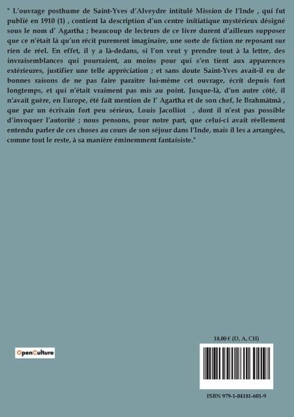 " L¿ouvrage posthume de Saint-Yves d¿Alveydre intitulé Mission de l¿Inde , qui fut publié en 1910, contient la description d¿un centre initiatique mystérieux désigné sous le nom d¿ Agartha ; beaucoup de lecteurs de ce livre durent d¿ailleurs supposer que ce n¿était là qüun récit purement imaginaire, une sorte de fiction ne reposant sur rien de réel. En effet, il y a là-dedans, si l¿on veut y prendre tout à la lettre, des invraisemblances qui pourraient, au moins pour qui s¿en tient aux apparences extérieures, justifier une telle appréciation ; et sans doute Saint-Yves avait-il eu de bonnes raisons de ne pas faire paraître lui-même cet ouvrage, écrit depuis fort longtemps, et qui n¿était vraiment pas mis au point. Jusque-là, d¿un autre côté, il n¿avait guère, en Europe, été fait mention de l¿ Agartha et de son chef, le Brahmâtmâ, que par un écrivain fort peu sérieux, Louis Jacolliot, dont il n¿est pas possible d¿invoquer l¿autorité ; nous pensons, pour notre part, que celui-ci avait réellement entendu parler de ces choses au cours de son séjour dans l¿Inde, mais il les a arrangées, comme tout le reste, à sa manière éminemment fantaisiste." Dans ce livre captivant, l'auteur explore les concepts ésotériques et les symboles traditionnels, proposant des interprétations profondes qui dépassent le domaine du matérialisme moderne. Le livre aborde la notion du "Roi du Monde" - un concept présent dans de nombreuses traditions anciennes qui symbolise une autorité spirituelle suprême ou un centre primordial autour duquel tourne l'ordre cosmique. Guénon examine comment ce concept s'inscrit dans diverses traditions spirituelles, et comment il offre une vision du monde qui transcende les divisions et les hiérarchies matérialistes. Outre son exploration du "Roi du Monde", Guénon explore d'autres symboles et concepts traditionnels, établissant des liens entre différentes traditions spirituelles et soulignant leur unité sous-jacente. Il utilise ces concepts pour critiquer le monde moderne, soulignant le déclin de la spiritualité et l'importance de revenir aux valeurs traditionnelles. "Le Roi du Monde" est une ¿uvre profonde et stimulante qui incite à la réflexion, proposant une vision du monde qui met l'accent sur la spiritualité et la tradition. C'est une lecture incontournable pour ceux qui s'intéressent à l'ésotérisme, à la philosophie traditionnelle et à la critique du monde moderne.