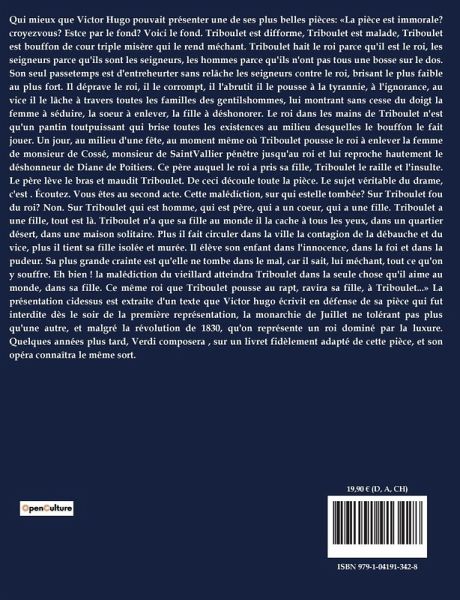 Qui mieux que Victor Hugo pouvait présenter une de ses plus belles pièces: «La pièce est immorale? croyezvous? Estce par le fond? Voici le fond. Triboulet est difforme, Triboulet est malade, Triboulet est bouffon de cour triple misère qui le rend méchant. Triboulet hait le roi parce qu'il est le roi, les seigneurs parce qu'ils sont les seigneurs, les hommes parce qu'ils n'ont pas tous une bosse sur le dos. Son seul passetemps est d'entreheurter sans relâche les seigneurs contre le roi, brisant le plus faible au plus fort. Il déprave le roi, il le corrompt, il l'abrutit il le pousse à la tyrannie, à l'ignorance, au vice il le lâche à travers toutes les familles des gentilshommes, lui montrant sans cesse du doigt la femme à séduire, la soeur à enlever, la fille à déshonorer. Le roi dans les mains de Triboulet n'est qu'un pantin toutpuissant qui brise toutes les existences au milieu desquelles le bouffon le fait jouer. Un jour, au milieu d'une fête, au moment même où Triboulet pousse le roi à enlever la femme de monsieur de Cossé, monsieur de SaintVallier pénètre jusqu'au roi et lui reproche hautement le déshonneur de Diane de Poitiers. Ce père auquel le roi a pris sa fille, Triboulet le raille et l'insulte. Le père lève le bras et maudit Triboulet. De ceci découle toute la pièce. Le sujet véritable du drame, c'est . Écoutez. Vous êtes au second acte. Cette malédiction, sur qui estelle tombée? Sur Triboulet fou du roi? Non. Sur Triboulet qui est homme, qui est père, qui a un coeur, qui a une fille. Triboulet a une fille, tout est là. Triboulet n'a que sa fille au monde il la cache à tous les yeux, dans un quartier désert, dans une maison solitaire. Plus il fait circuler dans la ville la contagion de la débauche et du vice, plus il tient sa fille isolée et murée. Il élève son enfant dans l'innocence, dans la foi et dans la pudeur. Sa plus grande crainte est qu'elle ne tombe dans le mal, car il sait, lui méchant, tout ce qu'on y souffre. Eh bien ! la malédiction du vieillard atteindra Triboulet dans la seule chose qu'il aime au monde, dans sa fille. Ce même roi que Triboulet pousse au rapt, ravira sa fille, à Triboulet...» La présentation cidessus est extraite d'un texte que Victor hugo écrivit en défense de sa pièce qui fut interdite dès le soir de la première représentation, la monarchie de Juillet ne tolérant pas plus qu'une autre, et malgré la révolution de 1830, qu'on représente un roi dominé par la luxure. Quelques années plus tard, Verdi composera , sur un livret fidèlement adapté de cette pièce, et son opéra connaîtra le même sort.