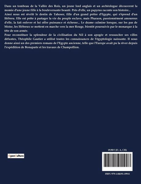 Dans un tombeau de la Vallée des Rois, un jeune lord anglais et un archéologue découvrent la momie d'une jeune fille à la bouleversante beauté. Près d'elle, un papyrus raconte son histoire... Ainsi nous est révélé le destin de Tahoser, fille d'un grand prêtre d'Egypte, qui s'éprend d'un Hébreu. Elle est prête à partager la vie du peuple esclave, mais Pharaon, passionnément amoureux d'elle, la fait enlever et lui offre puissance et richesse... Le drame culmine lorsque, sur les pas de Moïse, les Hébreux se mettent en marche vers la mer Rouge, bientôt poursuivis par le monarque à la tête de son armée. Pour reconstituer la splendeur de la civilisation du Nil à son apogée et ressusciter ses villes défuntes, Théophile Gautier a utilisé toutes les connaissances de l'égyptologie naissante. Il nous donne ainsi un des premiers romans de l'Egypte ancienne, telle que l'Europe avait pu la rêver depuis l'expédition de Bonaparte et les travaux de Champollion.