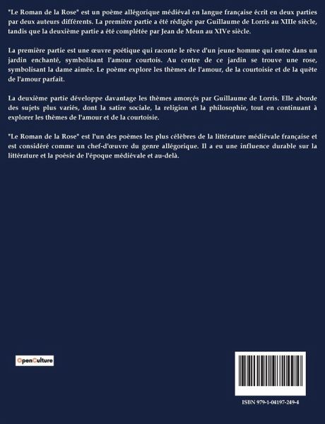 "Le Roman de la Rose" est un poème allégorique médiéval en langue française écrit en deux parties par deux auteurs différents. La première partie a été rédigée par Guillaume de Lorris au XIIIe siècle, tandis que la deuxième partie a été complétée par Jean de Meun au XIVe siècle. La première partie est une ¿uvre poétique qui raconte le rêve d'un jeune homme qui entre dans un jardin enchanté, symbolisant l'amour courtois. Au centre de ce jardin se trouve une rose, symbolisant la dame aimée. Le poème explore les thèmes de l'amour, de la courtoisie et de la quête de l'amour parfait. La deuxième partie développe davantage les thèmes amorçés par Guillaume de Lorris. Elle aborde des sujets plus variés, dont la satire sociale, la religion et la philosophie, tout en continuant à explorer les thèmes de l'amour et de la courtoisie. "Le Roman de la Rose" est l'un des poèmes les plus célèbres de la littérature médiévale française et est considéré comme un chef-d'¿uvre du genre allégorique. Il a eu une influence durable sur la littérature et la poésie de l'époque médiévale et au-delà.
