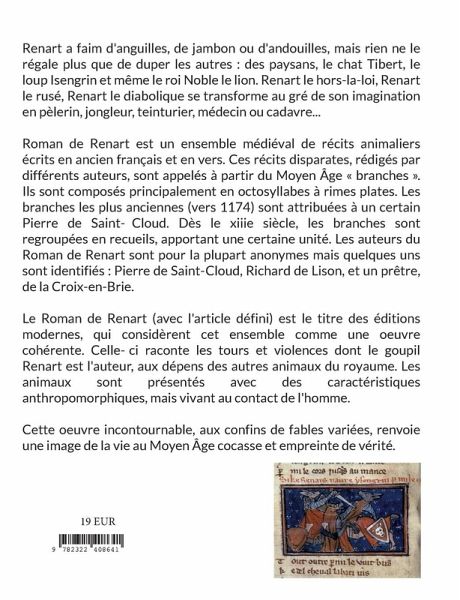 Renart a faim d'anguilles, de jambon ou d'andouilles, mais rien ne le régale plus que de duper les autres : des paysans, le chat Tibert, le loup Isengrin et même le roi Noble le lion. Renart le hors-la-loi, Renart le rusé, Renart le diabolique se transforme au gré de son imagination en pèlerin, jongleur, teinturier, médecin ou cadavre...Roman de Renart est un ensemble médiéval de récits animaliers écrits en ancien français et en vers. Ces récits disparates, rédigés par différents auteurs, sont appelés à partir du Moyen Âge « branches ». Ils sont composés principalement en octosyllabes à rimes plates. Les branches les plus anciennes (vers 1174) sont attribuées à un certain Pierre de Saint-Cloud. Dès le xiiie siècle, les branches sont regroupées en recueils, apportant une certaine unité. Les auteurs du Roman de Renart sont pour la plupart anonymes mais quelques uns sont identifiés : Pierre de Saint-Cloud, Richard de Lison, et un prêtre, de la Croix-en-Brie.Le Roman de Renart (avec l'article défini) est le titre des éditions modernes, qui considèrent cet ensemble comme une oeuvre cohérente. Celle-ci raconte les tours et violences dont le goupil Renart est l'auteur, aux dépens des autres animaux du royaume. Les animaux sont présentés avec des caractéristiques anthropomorphiques, mais vivant au contact de l'homme.Cette oeuvre incontournable, aux confins de fables variées, renvoie une image de la vie au Moyen Âge cocasse et empreinte de vérité.
