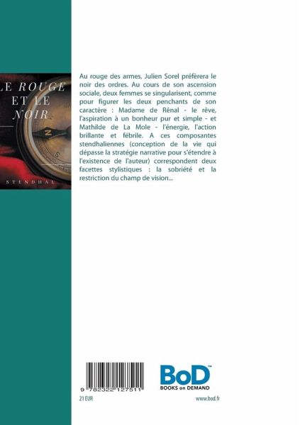Au rouge des armes, Julien Sorel préfèrera le noir des ordres. Au cours de son ascension sociale, deux femmes se singularisent, comme pour figurer les deux penchants de son caractère : Madame de Rênal - le rêve, l'aspiration à un bonheur pur et simple - et Mathilde de La Mole - l'énergie, l'action brillante et fébrile. A ces composantes stendhaliennes (conception de la vie qui dépasse la stratégie narrative pour s'étendre à l'existence de l'auteur) correspondent deux facettes stylistiques : la sobriété et la restriction du champ de vision.