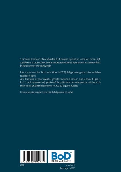"Le royaume de l'amour" est une adaptation des 4 évangiles, regroupés en un seul récit, dans un style agréable et un langage moderne. Le texte complet des évangiles est repris, organisé en chapitres utilisant les éléments venant de chaque évangile.