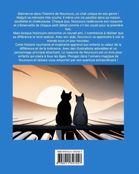 Bienvenue dans l'histoire de Nounours, un chat unique en son genre ! Malgré sa mémoire très courte, il mène une vie paisible dans sa maison douillette et chaleureuse. Chaque jour, Nounours redécouvre son royaume et s'émerveille de chaque petit détail comme s'il les voyait pour la première fois. Mais lorsque Nounours rencontre un nouvel ami, il commence à réaliser que sa différence le rend spécial. Avec son aide, Nounours va apprendre à embrasser sa singularité et à voir le monde sous un jour nouveau. Cette histoire touchante et inspirante apprend aux enfants la valeur de la différence et de la tolérance. Avec des illustrations adorables et un personnage principal attachant, Nounours est un livre pour enfants qui plaira à tous les âges. Plongez dans l'univers magique de Nounours et laissez-vous emporter par son aventure extraordinaire !