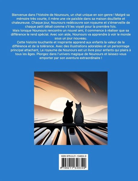 Bienvenue dans l'histoire de Nounours, un chat unique en son genre ! Malgré sa mémoire très courte, il mène une vie paisible dans sa maison douillette et chaleureuse. Chaque jour, Nounours redécouvre son royaume et s'émerveille de chaque petit détail comme s'il les voyait pour la première fois. Mais lorsque Nounours rencontre un nouvel ami, il commence à réaliser que sa différence le rend spécial. Avec son aide, Nounours va apprendre à embrasser sa singularité et à voir le monde sous un jour nouveau. Cette histoire touchante et inspirante apprend aux enfants la valeur de la différence et de la tolérance. Avec des illustrations adorables et un personnage principal attachant, Le royaume de Nounours est un livre pour enfants qui plaira à tous les âges. Plongez dans l'univers magique de Nounours et laissez-vous emporter par son aventure extraordinaire !