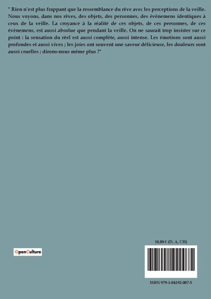 " Rien n¿est plus frappant que la ressemblance du rêve avec les perceptions de la veille. Nous voyons, dans nos rêves, des objets, des personnes, des évènemens identiques à ceux de la veille. La croyance à la réalité de ces objets, de ces personnes, de ces évènemens, est aussi absolue que pendant la veille. On ne saurait trop insister sur ce point : la sensation du réel est aussi complète, aussi intense. Les émotions sont aussi profondes et aussi vives ; les joies ont souvent une saveur délicieuse, les douleurs sont aussi cruelles ; dirons-nous même plus ?"