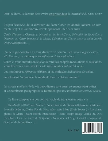 Dans ce livre, Le lecteur découvrira en profondeur la spiritualité du Sacré-Coeur (et ce n'est pas seulement l'amour de réparation, comme vous le découvrirez...).Les nombreuses références bibliques et les multiples déclarations des saints citées rendent l'ouvrage fécond et très stimulant. L'aspect historique est abordé assorti de commentaires ; de même que ses développements ultérieurs : Garde d'honneur, Chapelet du Sacré-Coeur, Dévotion au Coeur Immaculé de Marie, Solennité du Sacré-Coeur, Divine Miséricorde, Dévotion au Chaste Coeur de saint Joseph...L'auteur propose aussi tout au long du livre de nombreuses prières soigneusement sélectionnées, de même que des réflexions et des méditations. Celles-ci vous stimuleront et éveilleront vos propres méditations et réflexions. Vous trouverez aussi des textes de saints relatifs au Sacré-Coeur. Les aspects pratiques de la vie quotidienne sont abordés et soigneusement traités. De nombreux paragraphes se terminent par une invitation à des actions concrètes pour ceux qui le désirent.Ce livre complet a le pouvoir véritable de transformer votre vie et celles de ceux qui vous entoure...